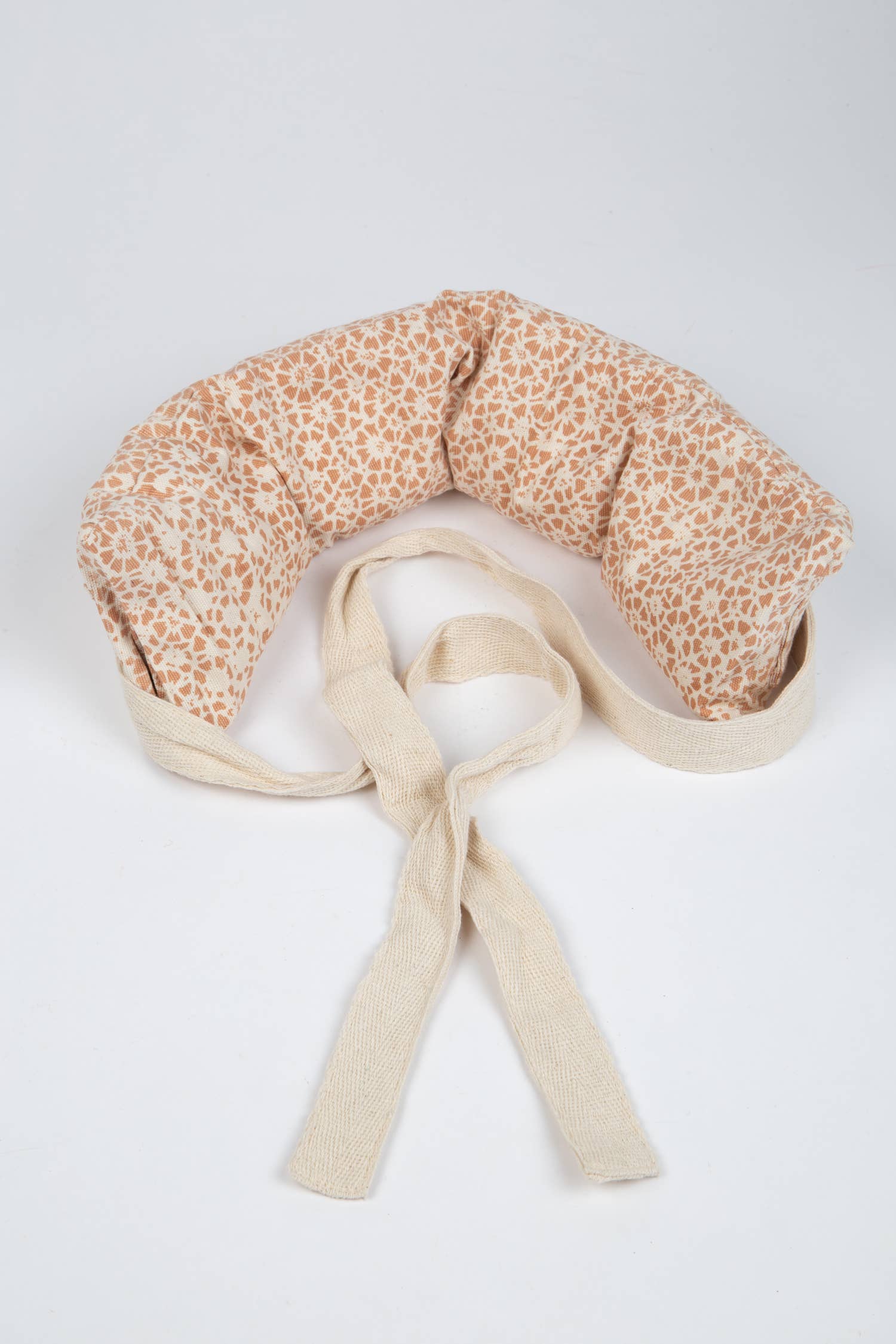 Ease your aches and pains with the Take Care Wrap. This cozy wrap features a malleable removable insert filled with rice and a soft, handwoven cotton wrap in a beautiful cream color with a tan floral design. Plus, this wrap is handcrafted in Nepal by artisans who use innovative processes to protect the environment. Simply heat up the wrap in the microwave and enjoy the soothing warmth for relief. A removable strap can also be threaded through loops on the back for added comfort. With a lokta paper sleeve that reads "The temperature therapy wrap your aches and pains are afraid of," this wrap not only provides physical relief but also inspires feelings of comfort and care.